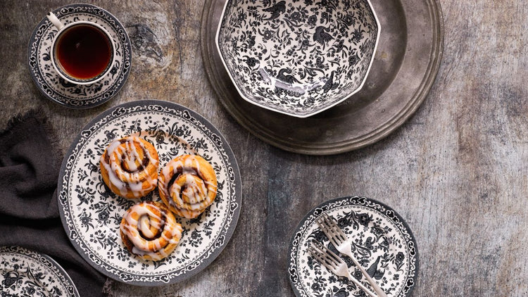 In 1913, Burleigh introduced the Blue Regal Peacock collection, originally called Regal Peacock. It was admired by many around the world, including Queen Mary. The collection was discontinued for a short time, before being reintroduced in 2013 with the new name, Blue Regal Peacock. Due to its popularity, we released the Black Regal Peacock design just four years later, to give this timeless design a modern edge.
