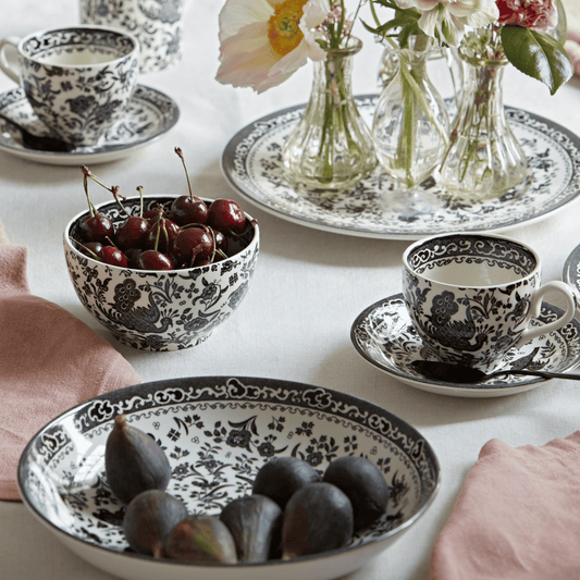 After printing, each piece is given a final glaze and firing, which not only seals in the decoration, but ensures that every piece in the Burleigh Black Regal Peacock collection is dishwasher and microwave safe.